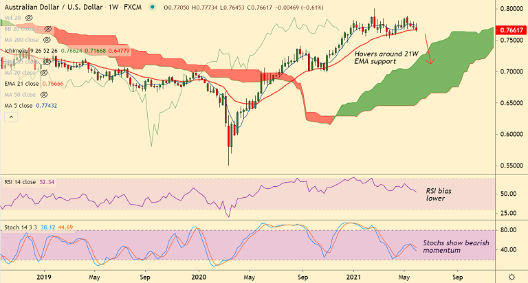 Support - 0.7667 (21W EMA), 0.7619 (38.2% Fib), 0.76