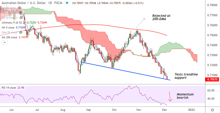Summary: AUD/USD trades with a strong bearish bias. Scope for dip below 0.70 handle.