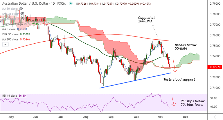 Summary: AUD/USD tests cloud support. The pair trades with a bearish bias, poised for further downside. Dip till 0.7245 likely.