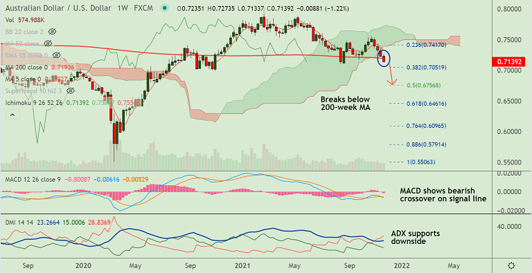Summary: AUD/USD is trading with a strong bearish bias. Weekly close below 200-week MA will open downside. Scope for test of 0.70 levels.