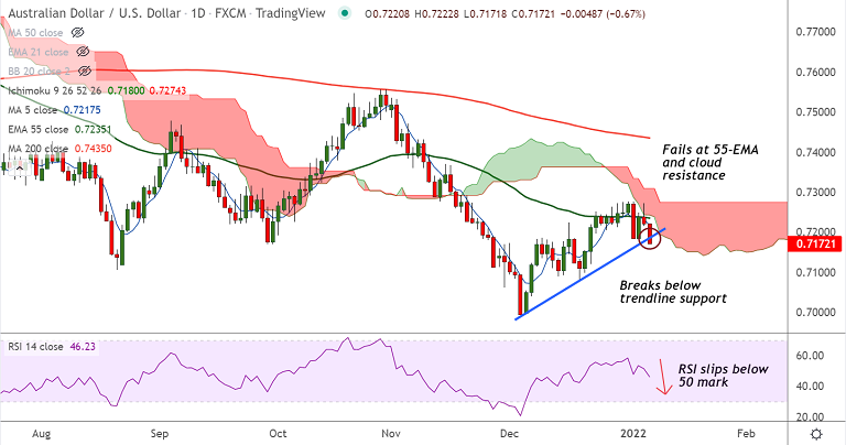 AUD/USD was trading 0.87% lower on the day at 0.7158 at around 07:45 GMT, bias turns bearish.