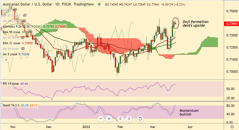 Support levels - 0.7334 (5-DMA), 0.7299 (200-DMA), 0.7252 (110-EMA)