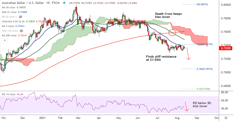Major bias for the pair is bearish. 21-EMA is stiff resistance (currently at 0.7386), capping any recovery attempts.