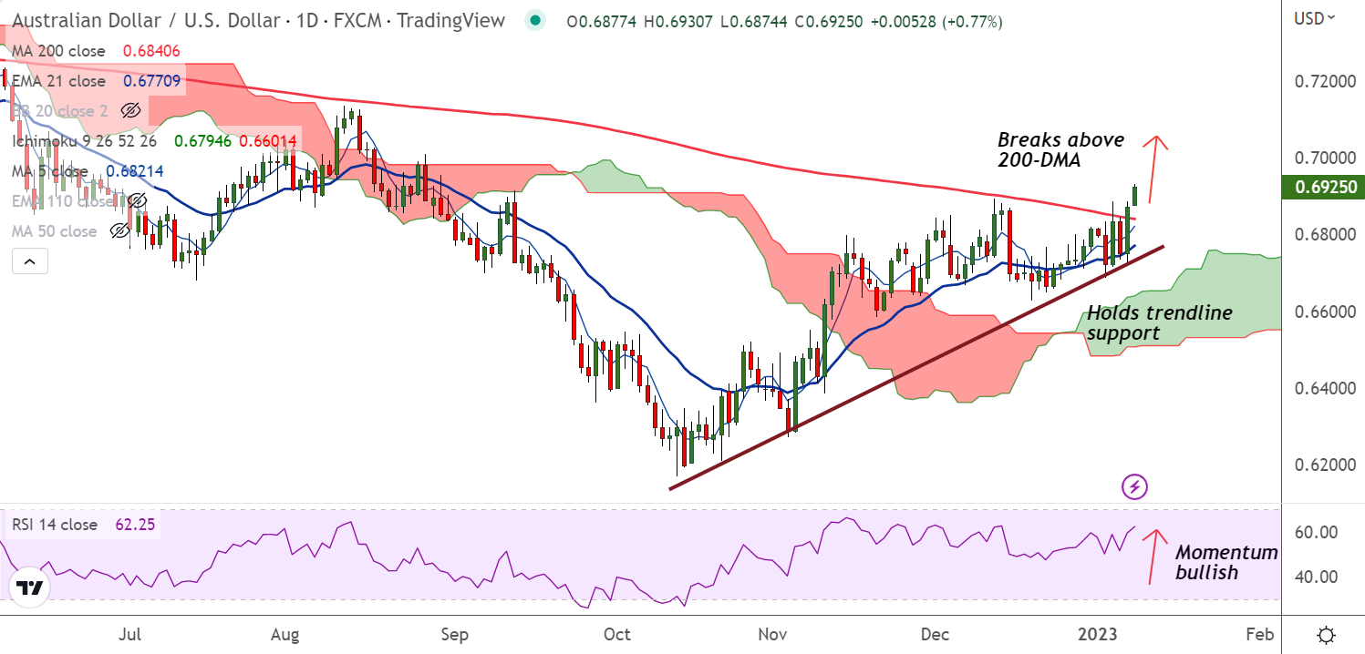 Summary: AUD/USD trades with a bullish bias. Scope for further gains. Next major resistance lies at 110-week EMA at 0.7035. Failure to hold above 200-DMA negates bullish bias.