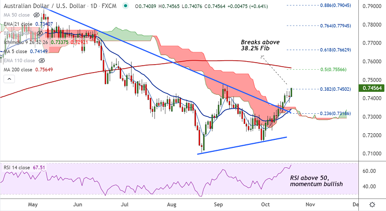 Momentum is bullish, volatility is high, scope for further gains. Next major resistance lies at 50% Fib at 0.7556 ahead of 200-DMA at 0.7564.