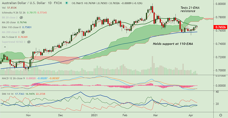 Support levels - 0.7637 (5-DMA), 0.7580 (110-EMA), 0.7528 (Lower BB)