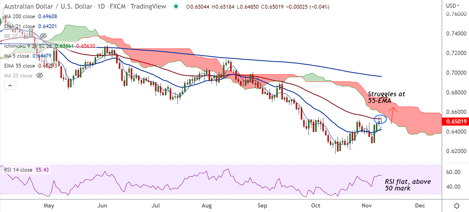 Summary: AUD/USD struggles at 55-EMA resistance, decisive break above required for upside continuation. Retrace below 21-EMA will negate any upside bias.
