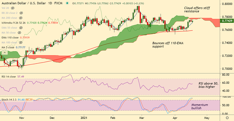 Break above daily cloud will buoy bulls in the pair. Next immediate hurdle lies at 0.7837 (Upper W BB).