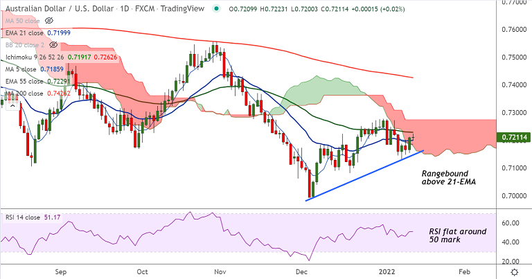 Support - 0.7199 (21-EMA), Resistance - 0.7229 (55-EMA)