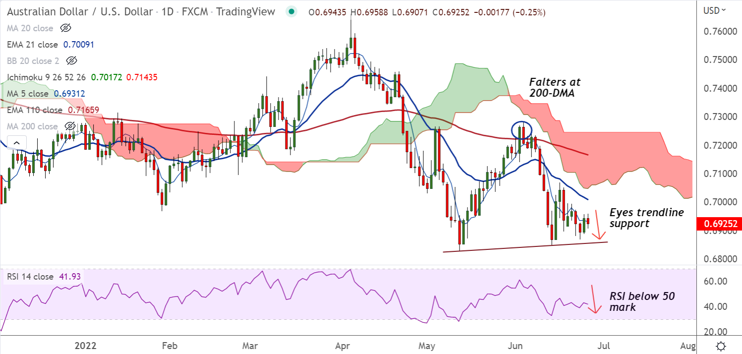 Summary: AUD/USD trades with a bearish bias. Scope for test of trendline support at 0.6855.