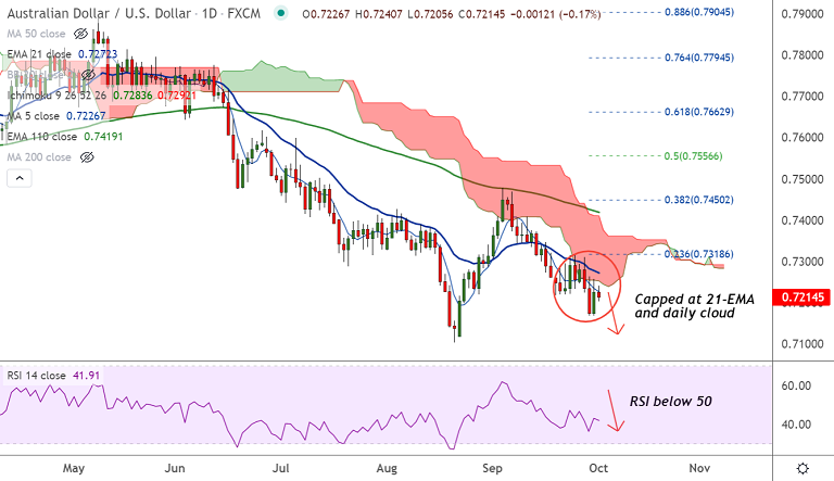 AUD/USD was trading 0.20% lower on the day at 0.7211 at around 06:10 GMT, outlook bearish.