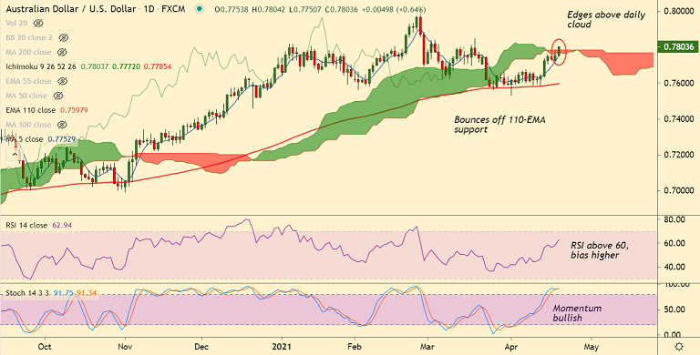 Support levels - 0.7751 (5-DMA), 0.7691 (21-EMA), 0.7681 (55-EMA)