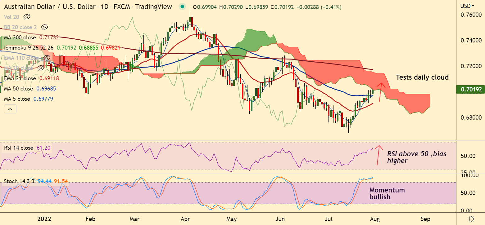Summary: Technical bias for the pair is bullish. AUD/USD is on track to test 110-EMA resistance at 0.7061. Decisive break above could see gains upto 200-DMA.