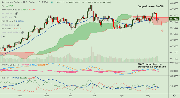Focus on US Retail Sales, Michigan Consumer Sentiment Index for impetus. Break below cloud will open downside. Scope for test of 200-DMA at 0.7488.