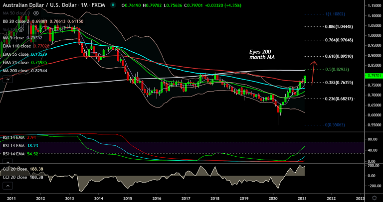 The pair is holding 4.29% gains for the month till date and is on track to test 200 month MA at 0.8254.