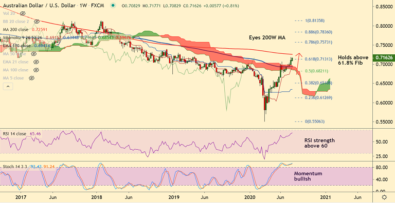 On the weekly charts the pair has broken above weekly cloud and is on track to test 200 W MA at 0.7259.