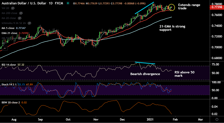 AUD/USD was trading rangebound at 0.7744 at around 06:00 GMT, with session high at 0.7763 and low at 0.7729.