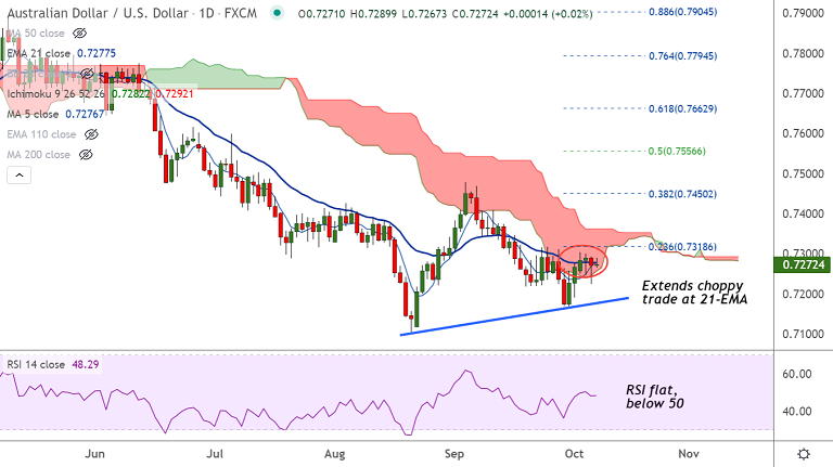 - AUD/USD extends sideways along 21-EMA