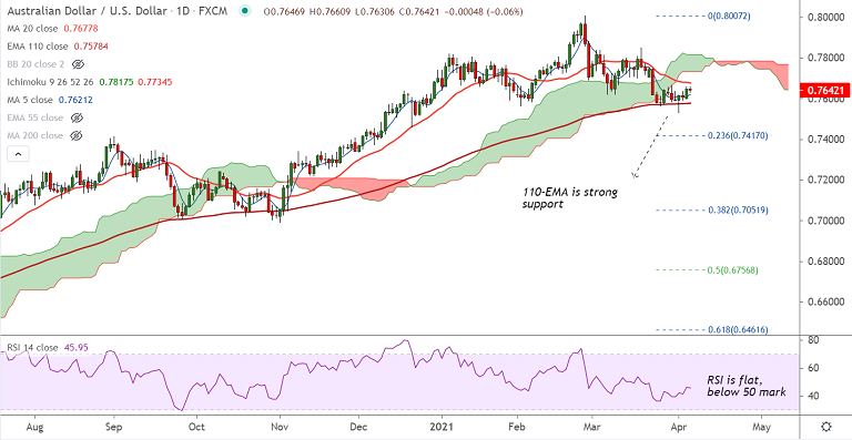 Summary: AUD/USD trades with a neutral bias and finds series of stiff resistance till 0.7675. Break above 0.7680 will change near term dynamics. Pullback has bounced off 110-EMA which is offering strong support at 0.7578. Breach below will drag the pair lower.