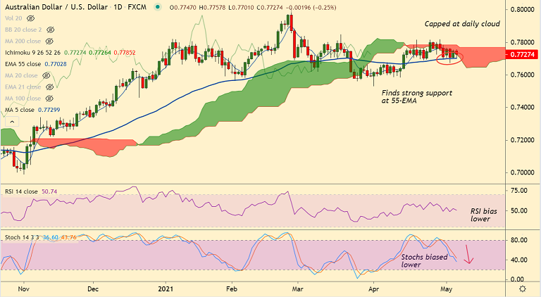 Technical indicators are biased lower. MACD shows bearish crossover on signal line. Price action is holding support at 55-EMA at 0.7702, break below will drag the pair lower.