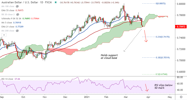 Next immediate support lies at 110-EMA at 0.7571. Further weakness will see test of 23.6% Fib at 0.7417 ahead of 200-DMA at 0.7357.