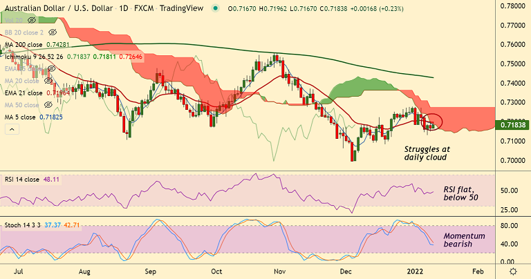 Summary: AUD/USD struggles for direction at 21-EMA and daily cloud resistance. Technical indicators show a bearish tilt. Break out above 21-EMA could change near-term bias. Focus on US inflation data and Fed speech for impetus.