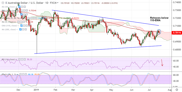 AUD/USD upside fails to hold above 110-EMA. The pair retraces gains to slip below.