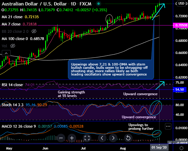 Technically, the prevailing upswings jump above 7, 21 & 100-DMA levels with the stern bullish candle, while bulls seem to be shrugging-off shooting star and hits a fresh 2-year’s highs. For now, more rallies likely as both leading oscillators show upward convergence (refer daily chart).