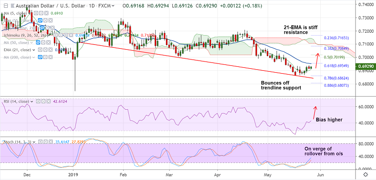 Price action trades shy of 21-EMA resistance at 0.6952, break above could see further upside.
