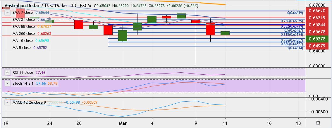 - On the downside, support is seen at 0.6480 (78.6% retracement of 0.6433 and 0.6657), a break below could drag it till 0.6433.