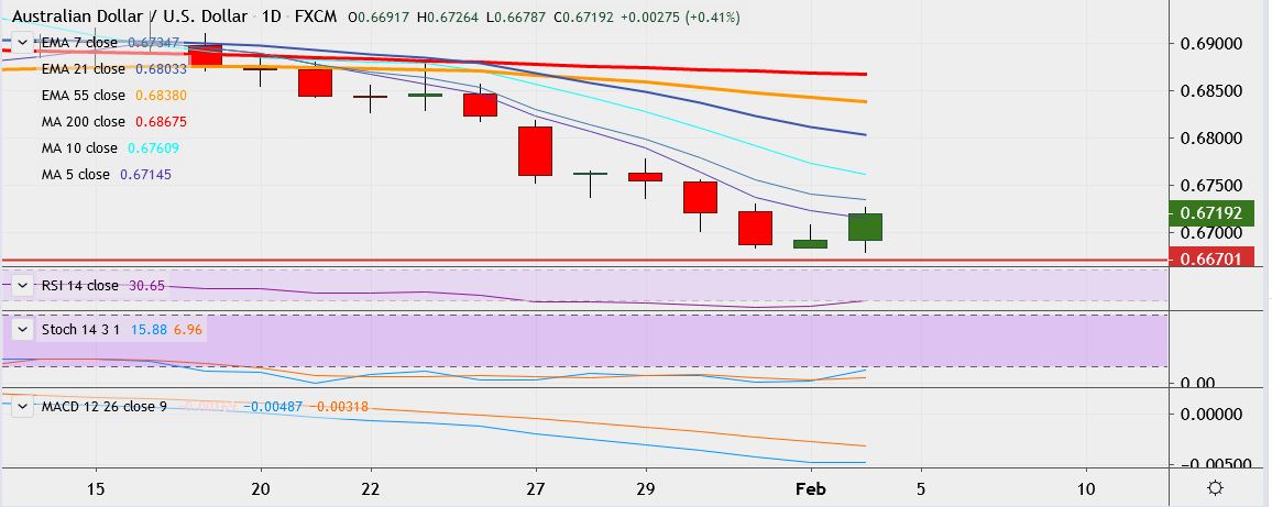 - Immediate resistance is located at 0.6739 (7-EMA), a break above could take it near 0.6773 (10-DMA).
