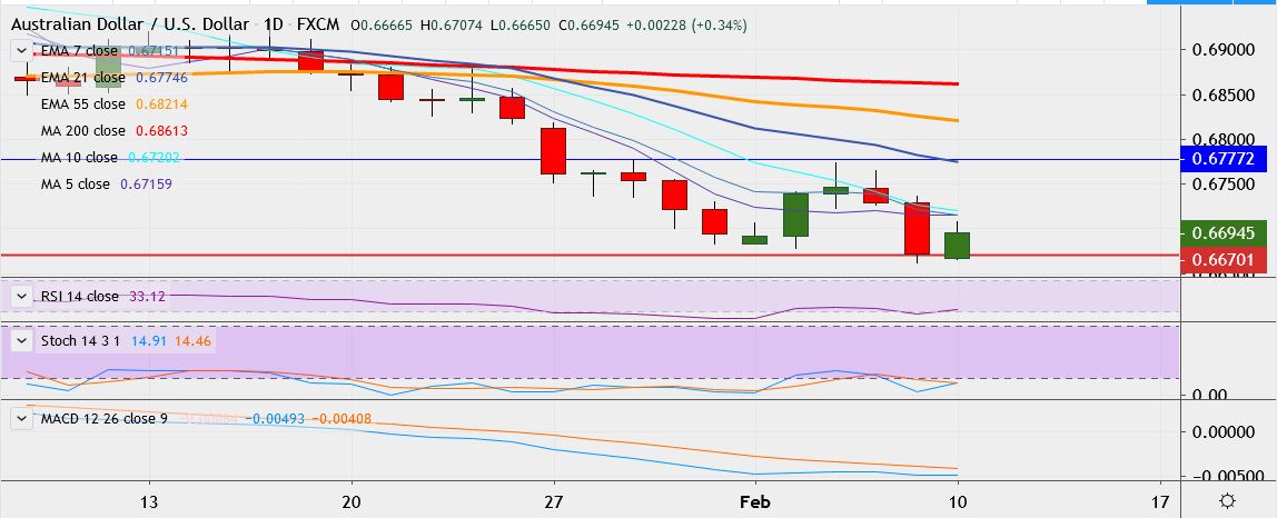 - Immediate resistance is located at 0.6715 (5-DMA), a break above could take it near 0.6755.