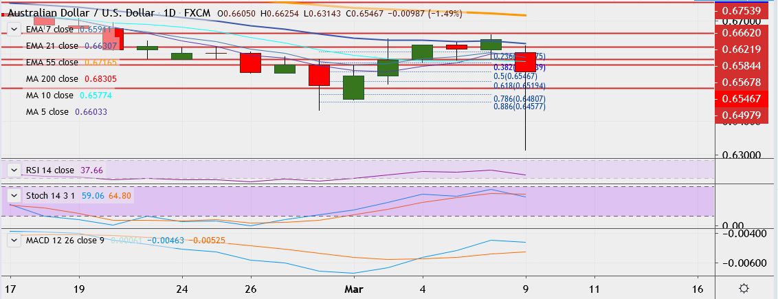 - On the downside, support is seen at 0.6519 (61.8% retracement of 0.6433 and 0.6657), a break below could drag it till 0.6481 (78.6% retracement).