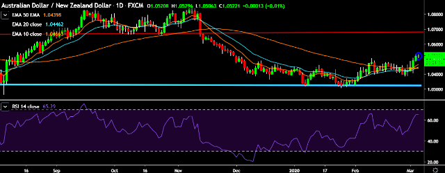 - AUD/NZD is currently trading around 1.0520 marks.