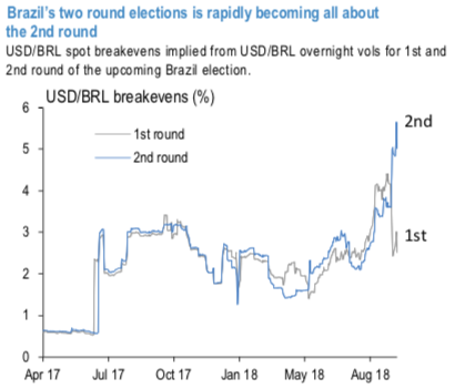 Long expiry BRL call ratios: At the currently fairly extended pricing of the 2nd round of the election event risk (refer above chart) the curve is unlikely to invert much further. Vol surfaces tend to drop after election events roll off, though within all likelihood of a sharp jump or drop in USDBRL spot the vol roll off is tricky to execute via outright vol structures. Low cost front tenor calendars of type short 6wk BRL call vs. long 2M BRL call spreads are problematic due to a high likelihood of a significant BRL spot /sell-off following the election announcement (6-8%).