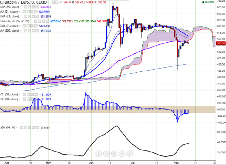 BTC/EUR is seen trading in red on Wednesday. The pair has declined slightly after making a high of 542.50 levels (CEXIO) on Aug 9th, 2016. It is currently trading around 533.91 at the time of writing.