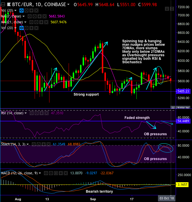 Technically, BTCEUR has formed Spinning top and hanging man patterns at 5,718.55 and 5,680 levels respectively, these bearish pattern candlesticks nudge the prices below 7DMAs, for now, more slumps likely only below 21DMAs as the overbought pressures signalled by both RSI & Stochastics on daily terms.