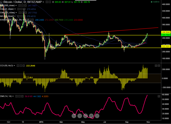BTC/USD has broken major resistance $300 and jumped till $308. The pair has declined till $296 and recovered from that level. It is currently trading at $306.75.
