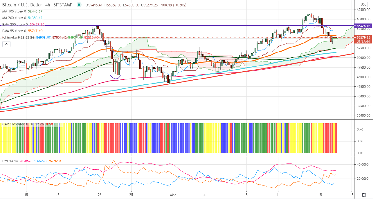 BTCUSD continues to trade lower for third consecutive days and lost more than 12% on the strong US dollar. The intraday trend is slightly on the lower side, as long as resistance $62000 holds. The pair is holding below 4-Hour Tenken-Sen and Kijun-Sen. Any below $52357 (100- 4H MA) confirms minor bearishness, a dip till $51300/$50400 (200- 4H EMA) is possible. On Mar 8th, 2021 the pair took support near 200- 4H EMA. This confirms shows that BTCUSD must close below $50400 for a further trend reversal. The support to be watched is $55000. Any violation below targets $54250/$53700/$53000.