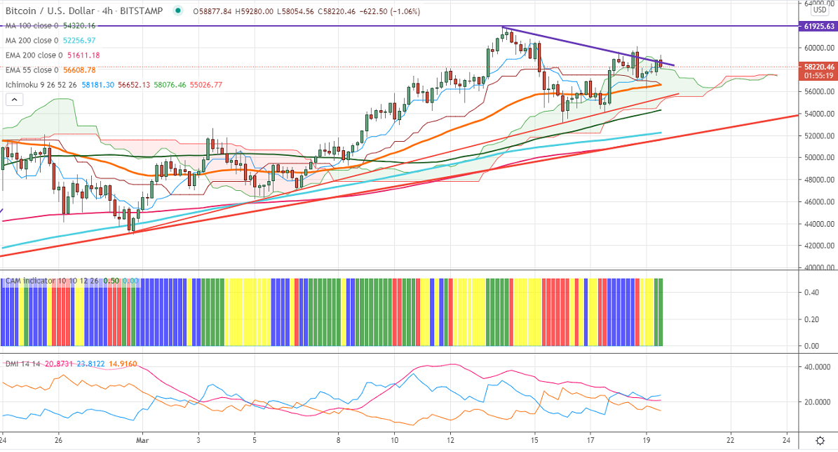 BTCUSD has once again declined after a minor jump above $60000. The strong buying in US dollar is putting pressure on this pair at higher levels. The overall trend is slightly on the lower side, as long as resistance $62000 holds. The pair is holding above 4 Hour Tenken-Sen and Kijun-Sen. Any violation below $56900 confirms minor bearishness, a dip till $56279/$55249 is possible. On Mar 16th, 2021 the pair took support near the trend line joining $43019 and $46529.This confirms shows that BTCUSD must close below $55300 for further minor weakness.