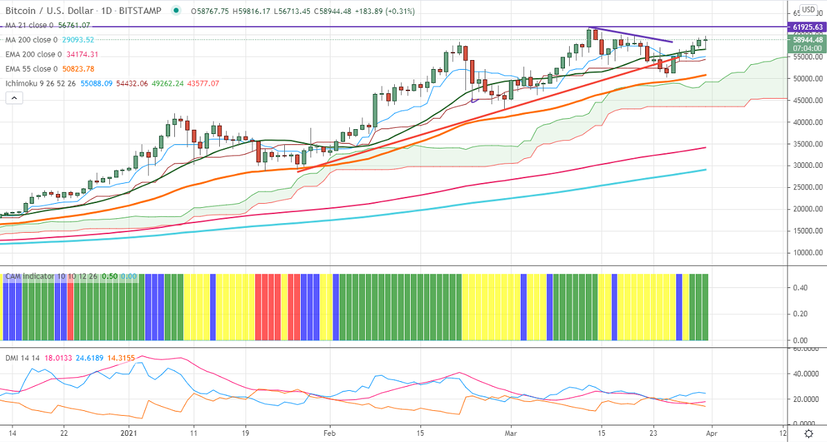 BTCUSD has taken support near 21- day MA and recovered more than $2000. The pair is holding well above the short term (21 and 50 day MA) and long term moving average (100 and 200- day MA). The intraday trend is still bullish as long as support $56500 holds. significant weakness only if it closes below the $49300 level. It hits an intraday high of $59814 and is currently trading around $59092.