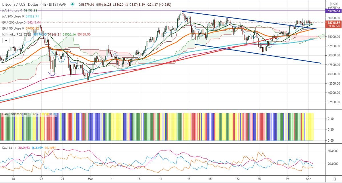 BTCUSD is consolidating in a narrow range between $56713 and $59667 for the past two days. The intraday trend is neutral as long as resistance $62000 holds. The pair is holding well above the 4-hour Tenken-Sen, Kijun-Sen, and cloud. The pair is holding above the Bull flag trend line, this confirms bullish continuation. Significant weakness only if it closes below the $54000 level. It hits an intraday high of $59816 and is currently trading around $58706.