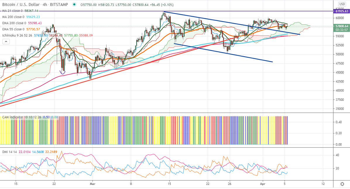BTCUSD is consolidating after a minor jump above $60000.The overall trend is neutral as long as resistance $62000 holds. The pair is holding slightly above the 4-hour Tenken-Sen and cloud. But it is still below Kijun-Sen. The pair is holding above the Bull flag trend line, any violation below $56450 confirms minor weakness. It hits an intraday high of $58120 and is currently trading around $57914.