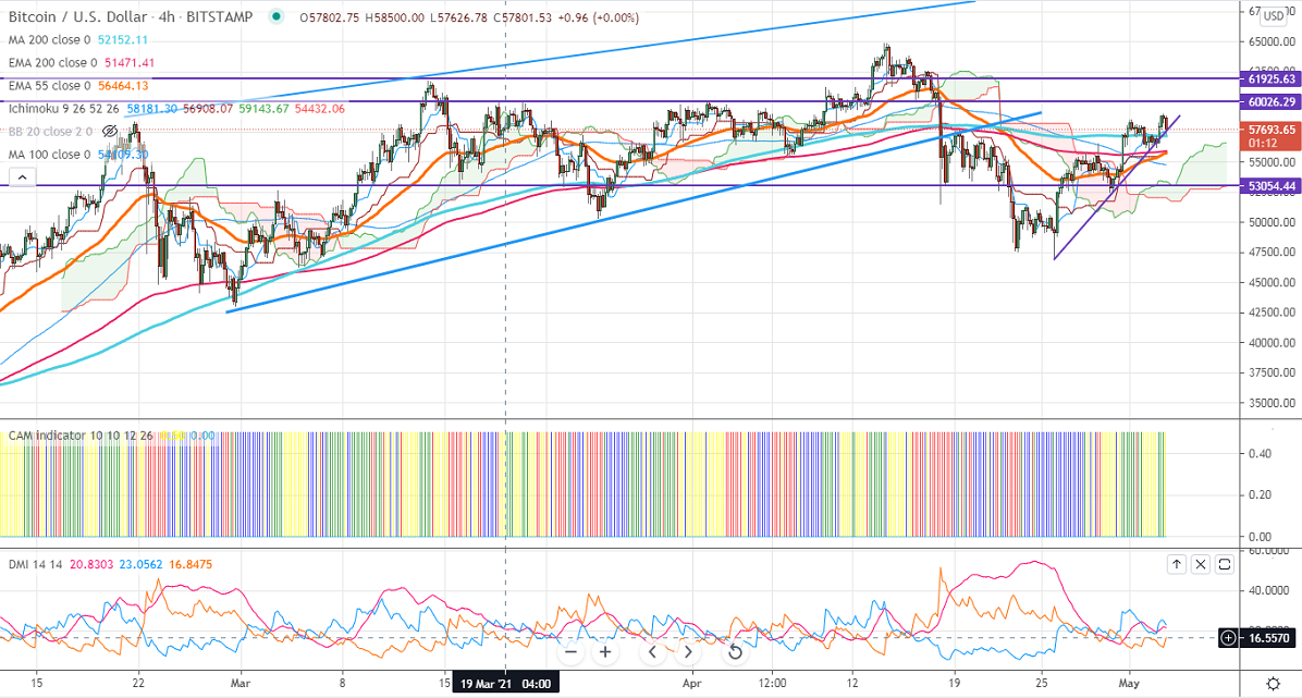 The pair's minor support is around $55650.A break below will drag the pair down till $53000/$51198 (100- day MA)/$47000/$43000 is possible. Significant bearishness only if it breaks $43000.