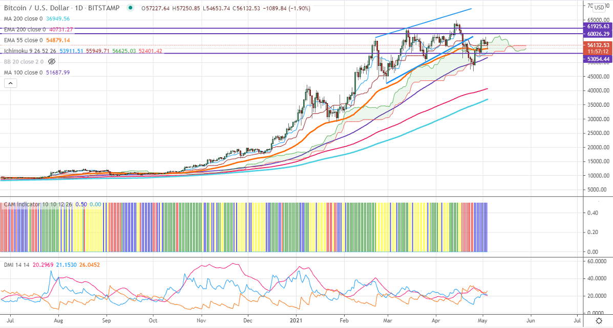 The pair's minor support is around $54300.A break below will drag the pair down to $53000/$51449 (100- day MA). Any daily close below $51450 will drag the pair down to $47000/$43000. Significant bearishness only if it breaks $43000.