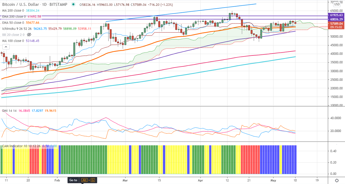 BTCUSD is consolidating in a narrow range between $59564 and $56256 for the past three days. The pair downside is capped by 50-day EMA and significant weakness only below that level. The overall trend of Bitcoin is still bullish as long as support $47000 holds. Previously BTCUSD has recovered after a minor decline below 100-day MA. The Bitcoin is holding above 50 and 100- day MA. It hits an intraday low of $57176 and is currently trading around $57518.