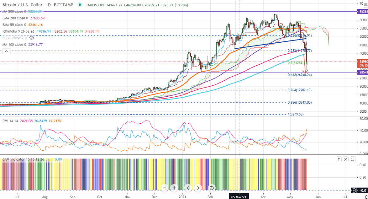 BTCUSD continues to trade lower and has shown massive sell-off after China bans cryptocurrency payments. The pair has broken significant support at $39691 (200- day MA). This confirms bearish trend continuation, a dip till $28800 is possible. The intraday trend is still on the lower side as long as resistance $40700 holds. It was one of the worst performers in the past two weeks and lost more than 45%. It hits an intraday low of $30006 and is currently trading around $36650.