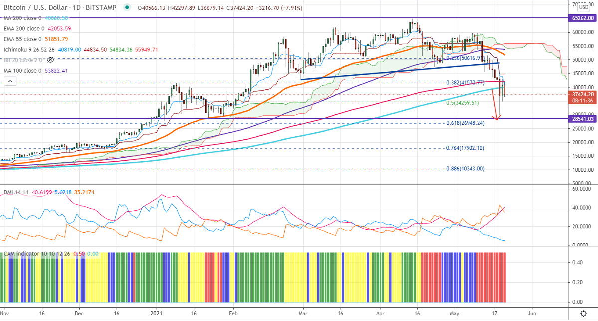 The pair's minor support is around $35000. Any convincing break below will drag the pair down to $30000/$28392/$26948 (61.8% fib). Any close below $26900 will drag the pair down to $20000.