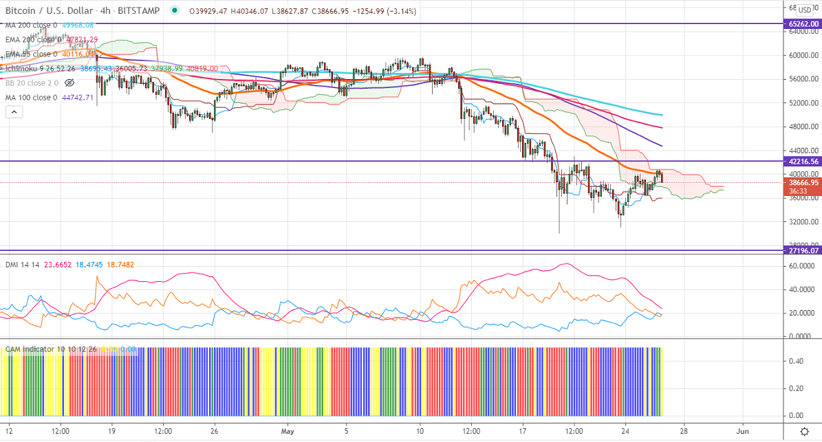 BTCUSD has declined after a minor pullback above $40000 levels. The intraday trend is bearish as long as resistance $43000. The pair is consolidating in a narrow range after a major sell-off of more than 45% this month. The ban on Bitcoin by China is putting pressure on this pair at higher levels. It hits an intraday high of $40855 and is currently trading around $37943.