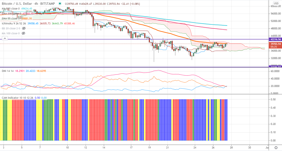 BTCUSD is consolidating in a narrow range with no major buying happening above $40000. The pair is still in bearish hands after a major sell-off in two days May 19th and May 23rd. The intraday trend is bearish as long as resistance $43000. Bitcoin surged more than 100% this year and hits an all-time high of $64895. It hits an intraday high of $40429 and is currently trading around $39720.